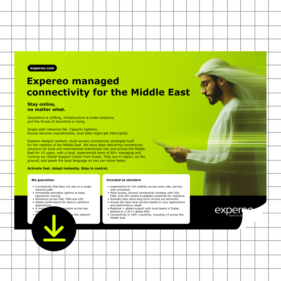 Network resilience in the Middle East means the difference between staying operational or going dark. With geopolitical pressure, constrained infrastructure, and unpredictable routing, single-path networks fail fast. At Expereo, we design multi-access connectivity that adapts in real time. From fiber to FWA and LEO, we keep enterprises online, protected, and ready to move at the speed business demands.”